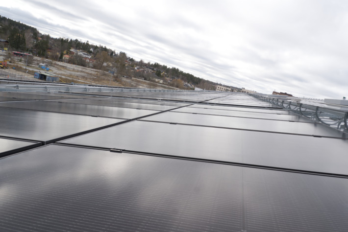På taket breder en cirka 1000 kvadratmeter stor solcellsanläggning som försörjer delar av stationens energibehov.
